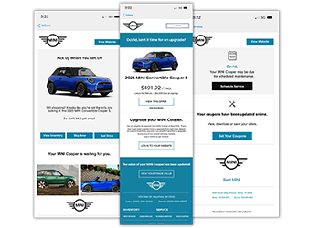 Move customers down the funnel with trigger emails designed to convert passive shoppers into active leads. These automated emails precisely re-engage shoppers based on dozens of specific customer actions. For example, after visiting your website, customers will receive an email with a personalized offer on the exact vehicle they shopped for. On the service side, customers will receive an email before their upcoming appointment with customized upgrade offers and vehicle appraisal options. Smart Emails are 100% automated with personalized content tailored to every customer. These dynamic emails are impossible for CRM’s or humans to create and have 26% higher open rates than traditional emails.
